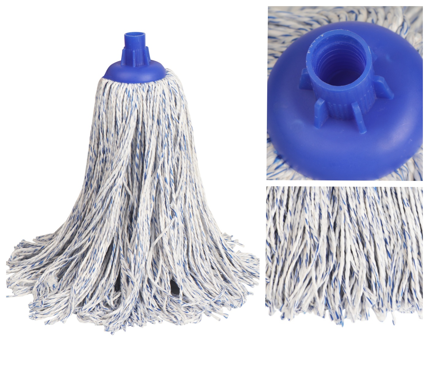 Deze duurzame dweilkop is gemaakt van een witte katoenmix met blauwe vlekken, gecombineerd met een stevige blauwe plastic schroefdop. Het is ontworpen voor een hoog absorptievermogen en langdurige prestaties en is ideaal voor zowel huishoudelijk als commercieel nat dweilen, en biedt betrouwbare reinigingskracht voor dagelijks gebruik.