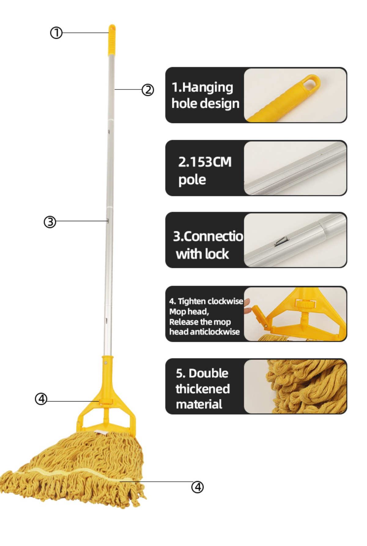 Commerciële Loop End Mop, bestaande uit een gesplitste aluminium steel en een lusmopkop, biedt een efficiënte en flexibele reinigingsoplossing. De aluminium paal kan vrij in lengte worden aangepast om zich aan te passen aan verschillende hoogtebehoeften voor schoonmaken, wat ideaal is voor hotels, ziekenhuizen, magazijnen en andere reinigingsscenario's met hoge intensiteit.